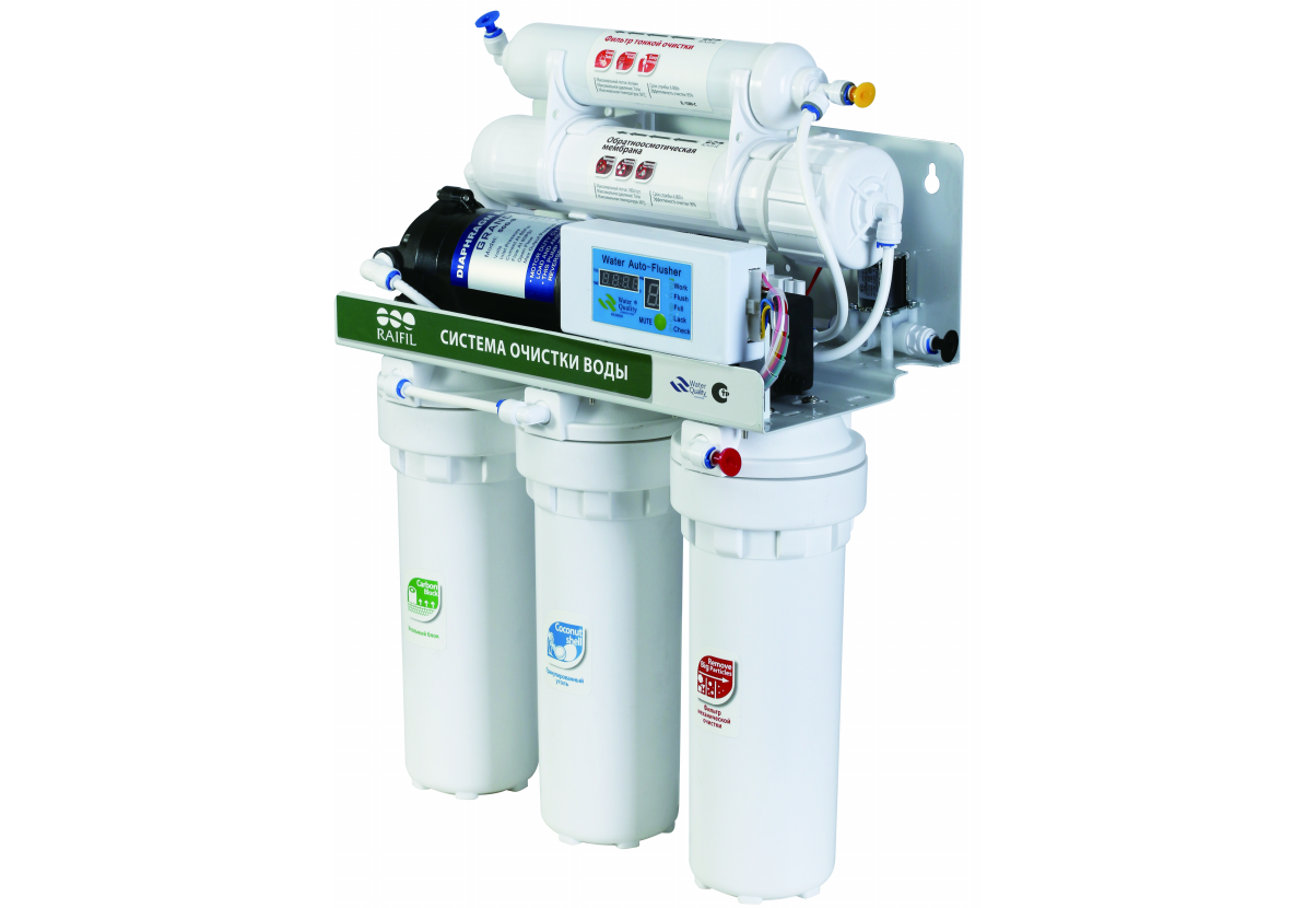 5-стадийная система обратного осмоса Raifil RO50-D1 с контроллером представляет собой совершенный фильтр на сегодня. Обратноосмотическая мембрана Raifil работает по принципу проникновения молекул сквозь тонкопленочную полупроницаемую мембрану с порами 0,0001 микрон под давлением. В процессе обратного осмоса происходит отделение молекул воды от всех остальных примесей и загрязнений, после чего на выходе получается полностью чистая вода.