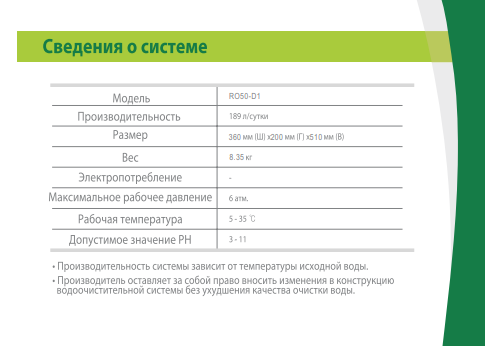 Технические характеристики обратного осмоса Raifil RO50-D1: