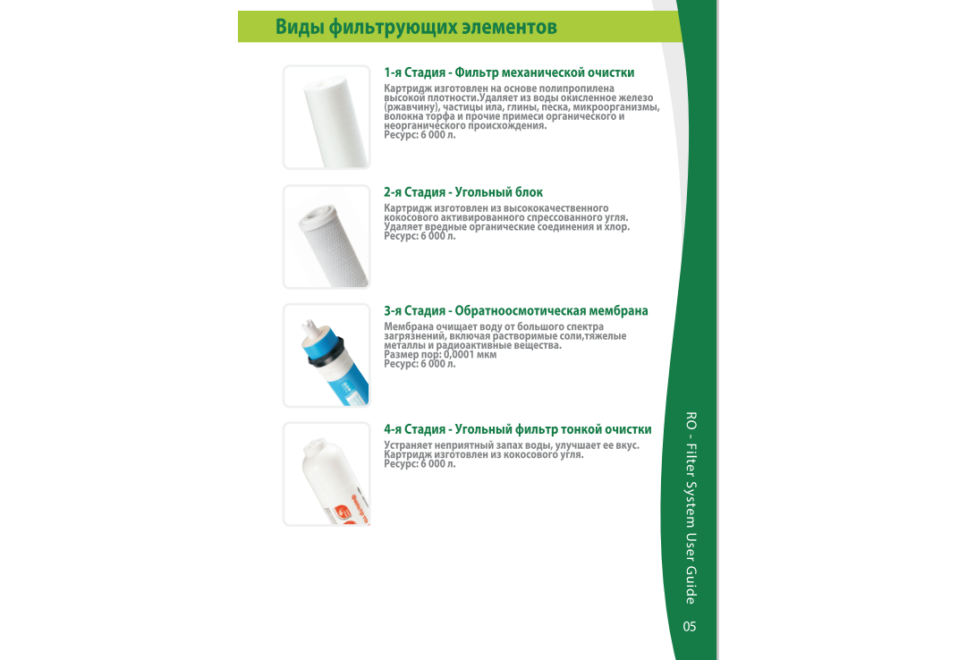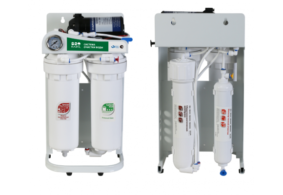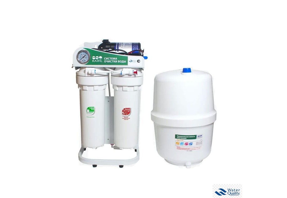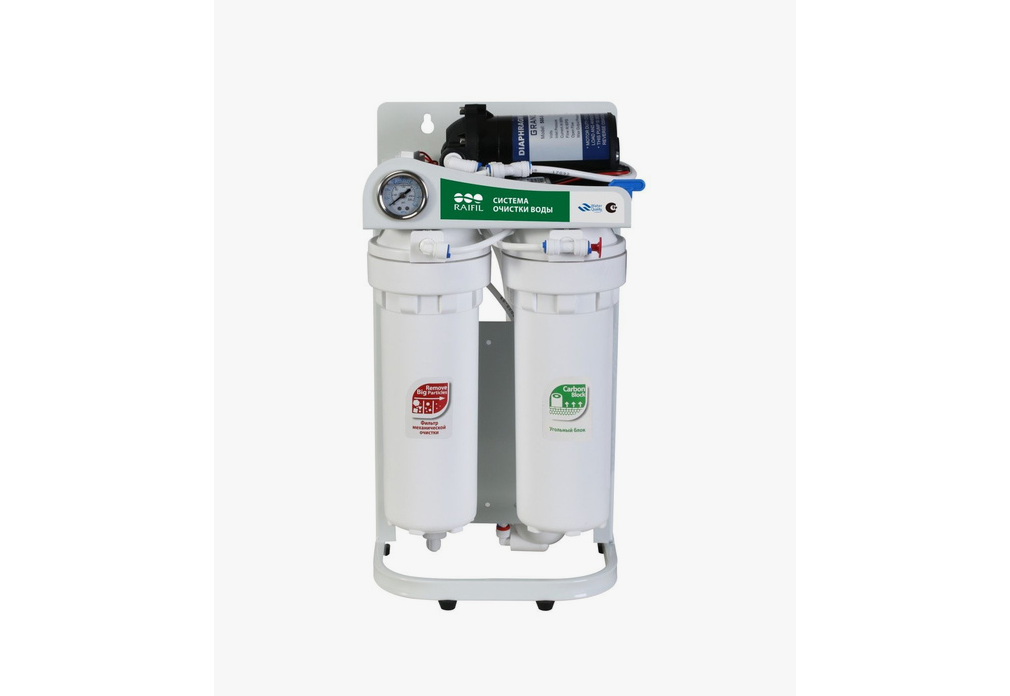 Четырехступенчатая система обратного осмоса Raifil RO50-G с насосом представляет собой совершенный фильтр на сегодня. Обратноосмотическая мембрана Raifil работает по принципу проникновения молекул сквозь тонкопленочную полупроницаемую мембрану с порами 0,0001 микрон под давлением. В процессе обратного осмоса происходит отделение молекул воды от всех остальных примесей и загрязнений, после чего на выходе получается полностью чистая вода.