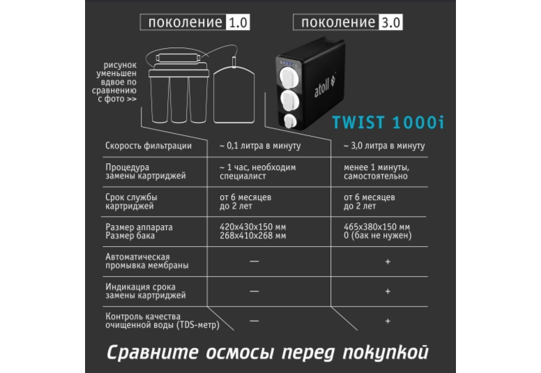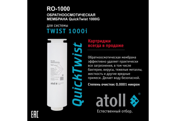 - Мембрана обратноосмотическая atoll TWIST RO-1000 с anti-scale добавкой - эффективно удаляет практически все загрязнения в том числе бактерии и вирусы. Делает воду безопасной. А добавленный антискалант - продлевает сроек её службы