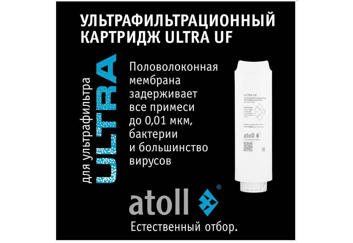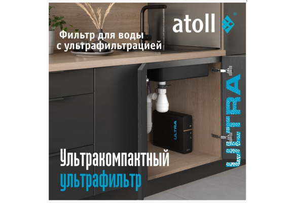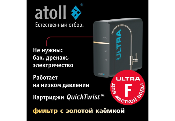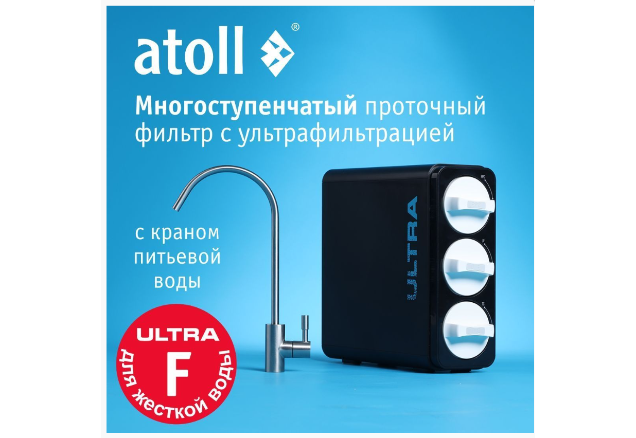 Ультрафильтрационный проточный фильтр для получения питьевой воды Atoll ULTRA F (для жесткой воды) - простой и надежный фильтр для квартир и коттеджей. Отличительная особенность фильтра- ультракомпактный блок фильтр, который не занимает много места и прост в обслуживании.