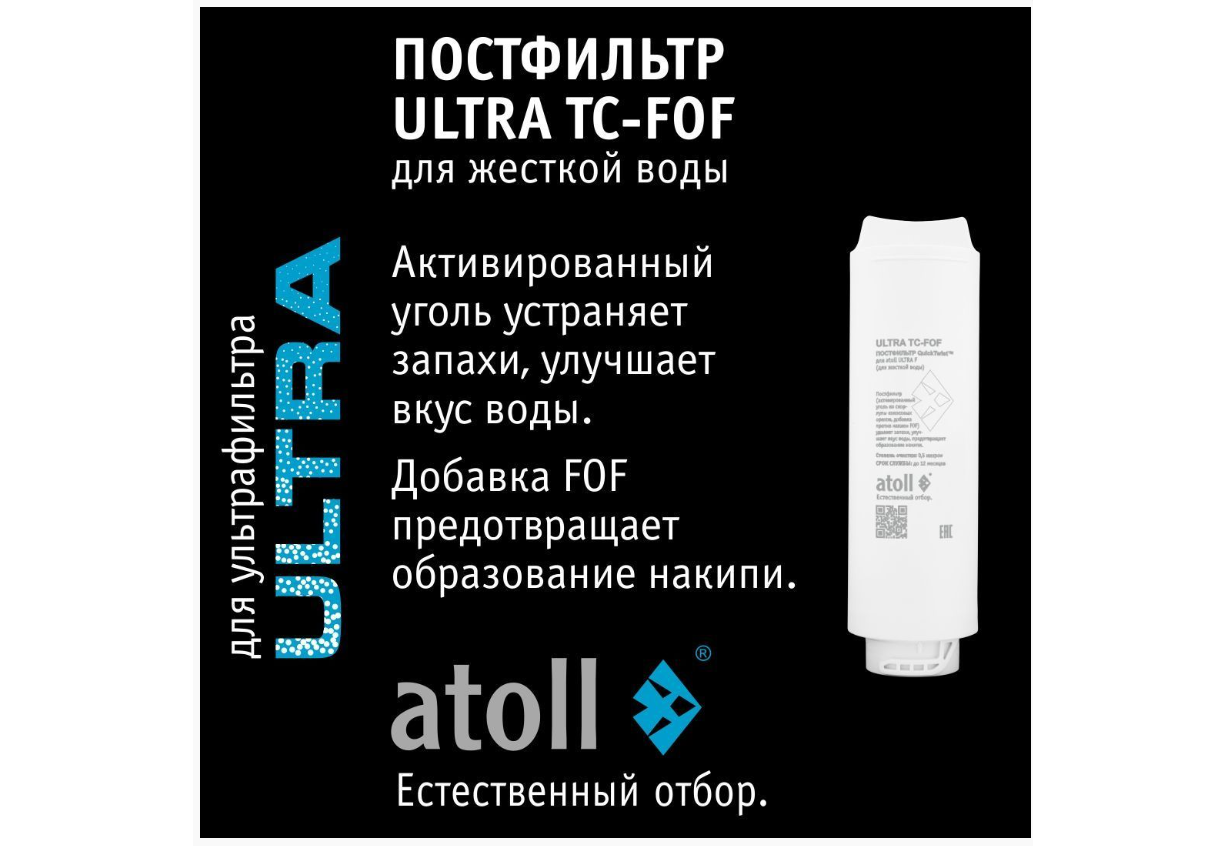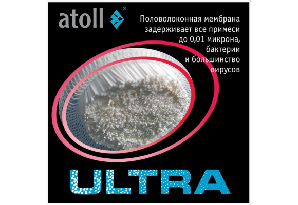 Ультратонкая очистка воды осуществляется ультрафильтрационными волокнами картриджа atoll ULTRA UF. Размер пор волокон составляет не более 0,01 мкм, это позволяет удалять из воды практически весь бактериальный состав, а защита от накипи происходит за счет картриджа Atoll TC-FOF. Он обладает дополнительной функцией – предотвращения образования накипи за счет связывания ионов кальция (Ca²⁺) и магния (Mg²⁺).