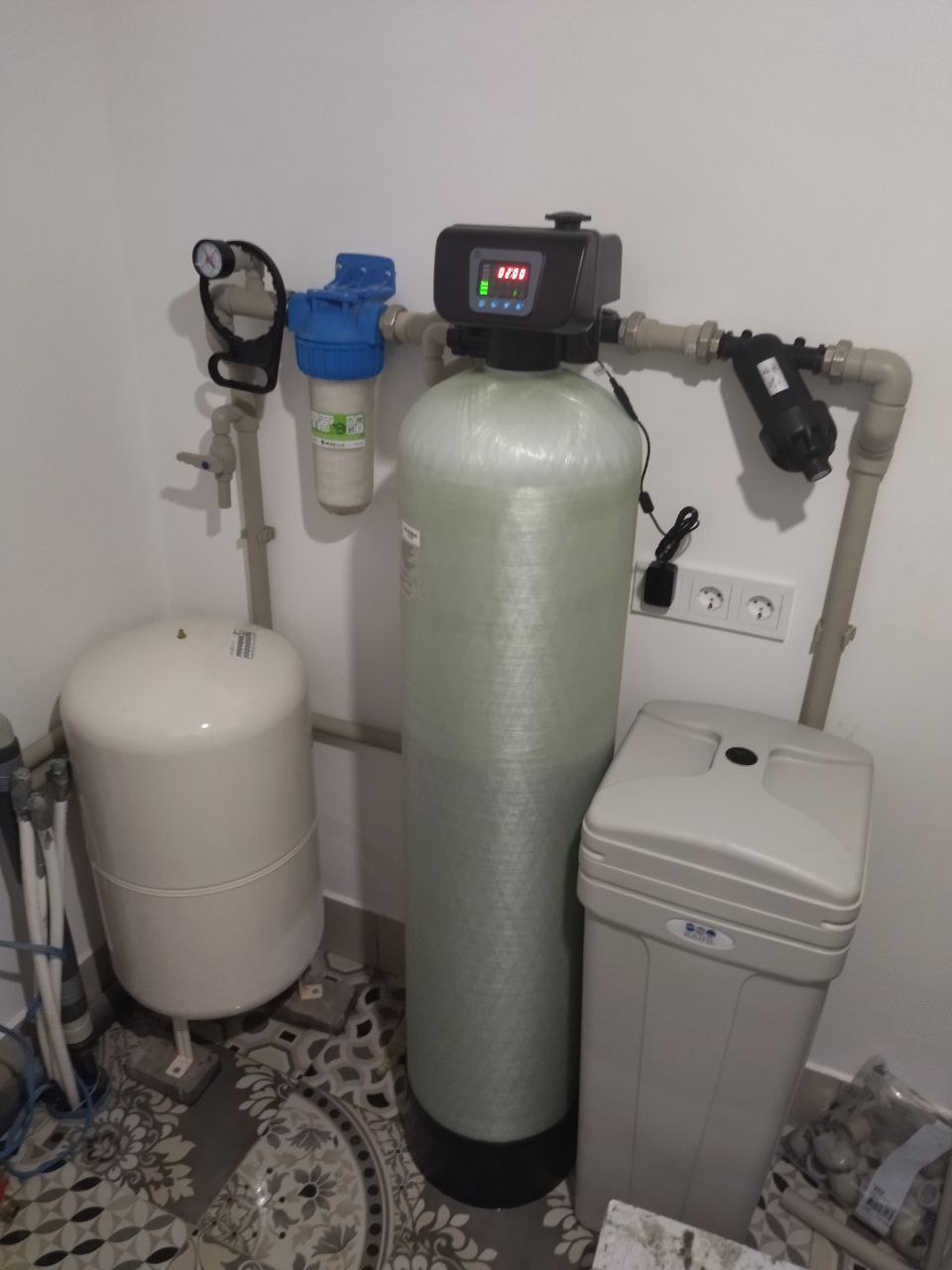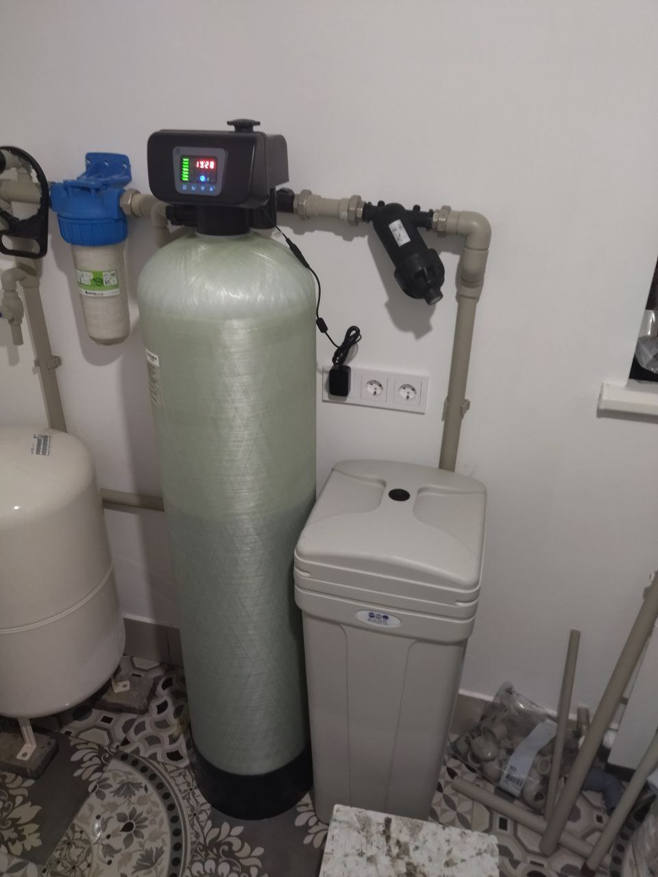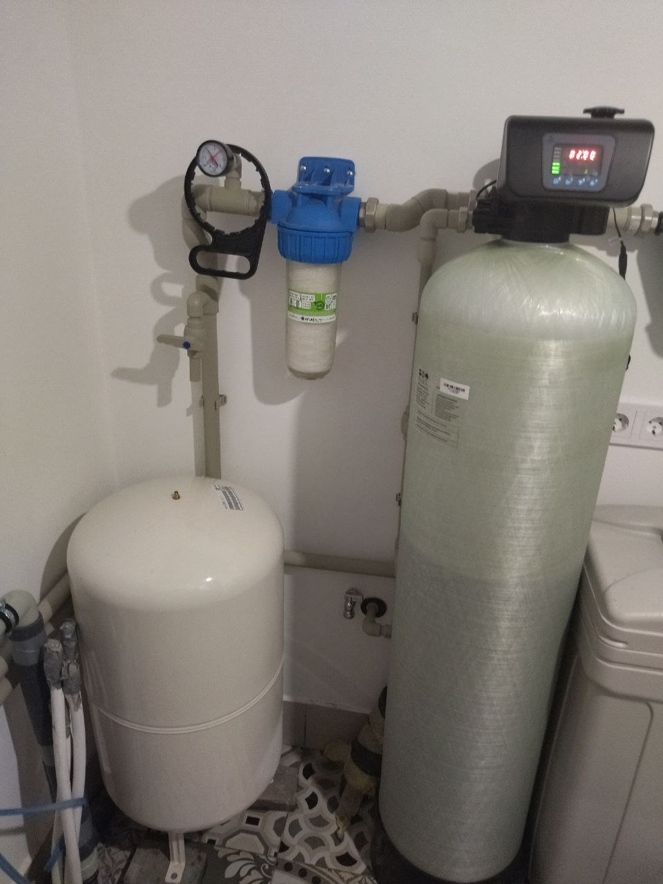 На выходе остался фильтр с полипропиленовым картриджем, который ранее был установлен в доме. Он обеспечивает предотвращение возможных проскоков частиц, крупностью более 10 мкм во время регенерации системы умягчения.